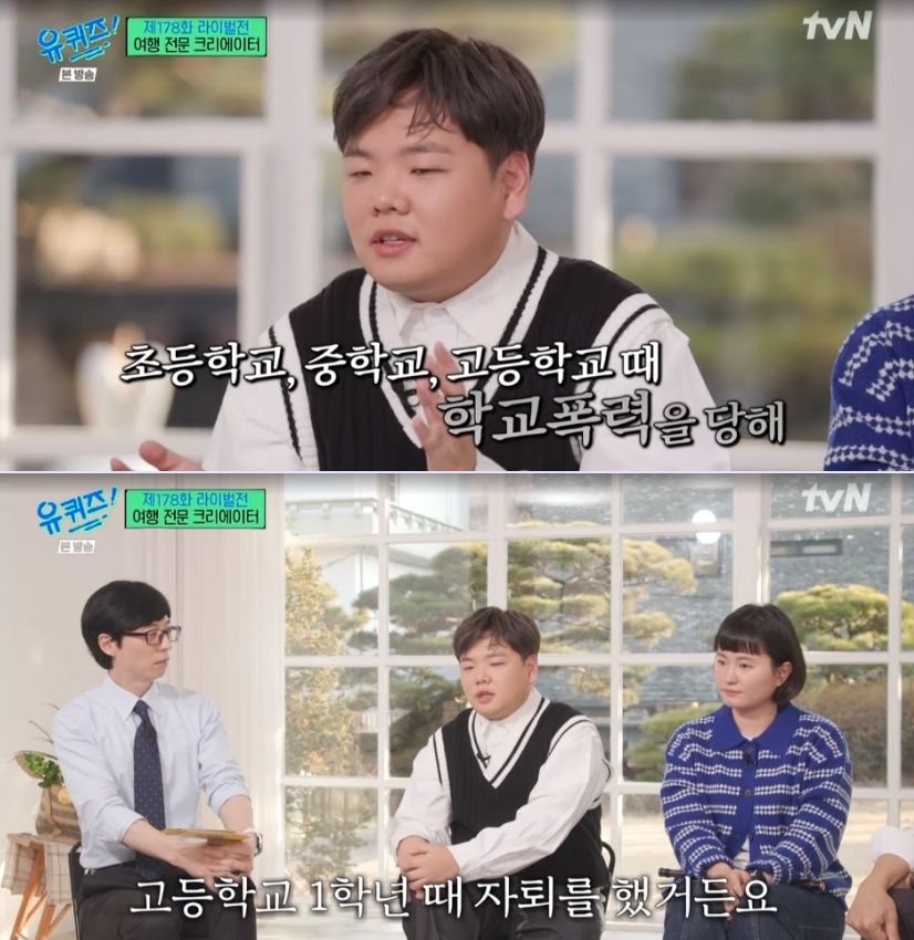 그래서 외모와 가난으로 곽튜브 초등학생 때부터 고등학생 때까지 학교폭력 피해자로 괴로운 학창 시절을 보냈으며 그 스트레스로 과민성 대장 증후군으로 입원과 결석하는 날이 많아지고 대인기피증까지 오며 결국 고등학교를 자퇴 하게 됐다고 합니다.
