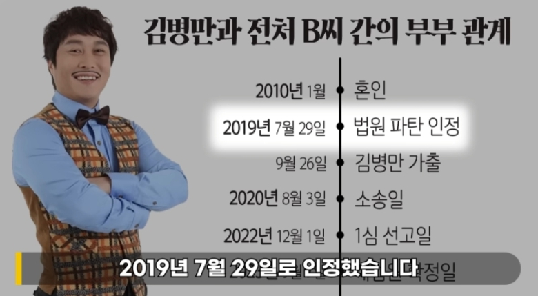 김병만 전처 이수경에게 이혼을 여러 번 제안했었지만 전 부인은 거부를 했고 경제권을 돌려주지 않으며 소송으로 이혼을 진행하게 되었다고 밝혔으며 입양한 전부인이 혼인 과정 중 재산관리 부분에 반소하는 가운데 입양한 딸과 폭행을 당했다고 혼인 파탄의 귀책을 김병만에게 물으려 했으나 입양 딸의 진술서로 아님이 밝혀지며 긴 소송 끝에 결국 두 사람 2023년 법원 판결로 이혼을 했습니다.