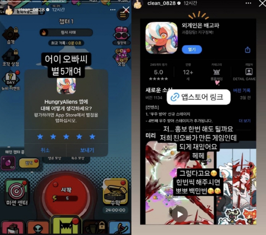 지난해 김세정 오빠의 정체에 대해 자신의 계정을 통해 폭로하기도 했었는데요. 자신의 계정 스토리에 "어이 오빠씨 별 5개여"라며 게임 하나를 캡처해 올렸었습니다.