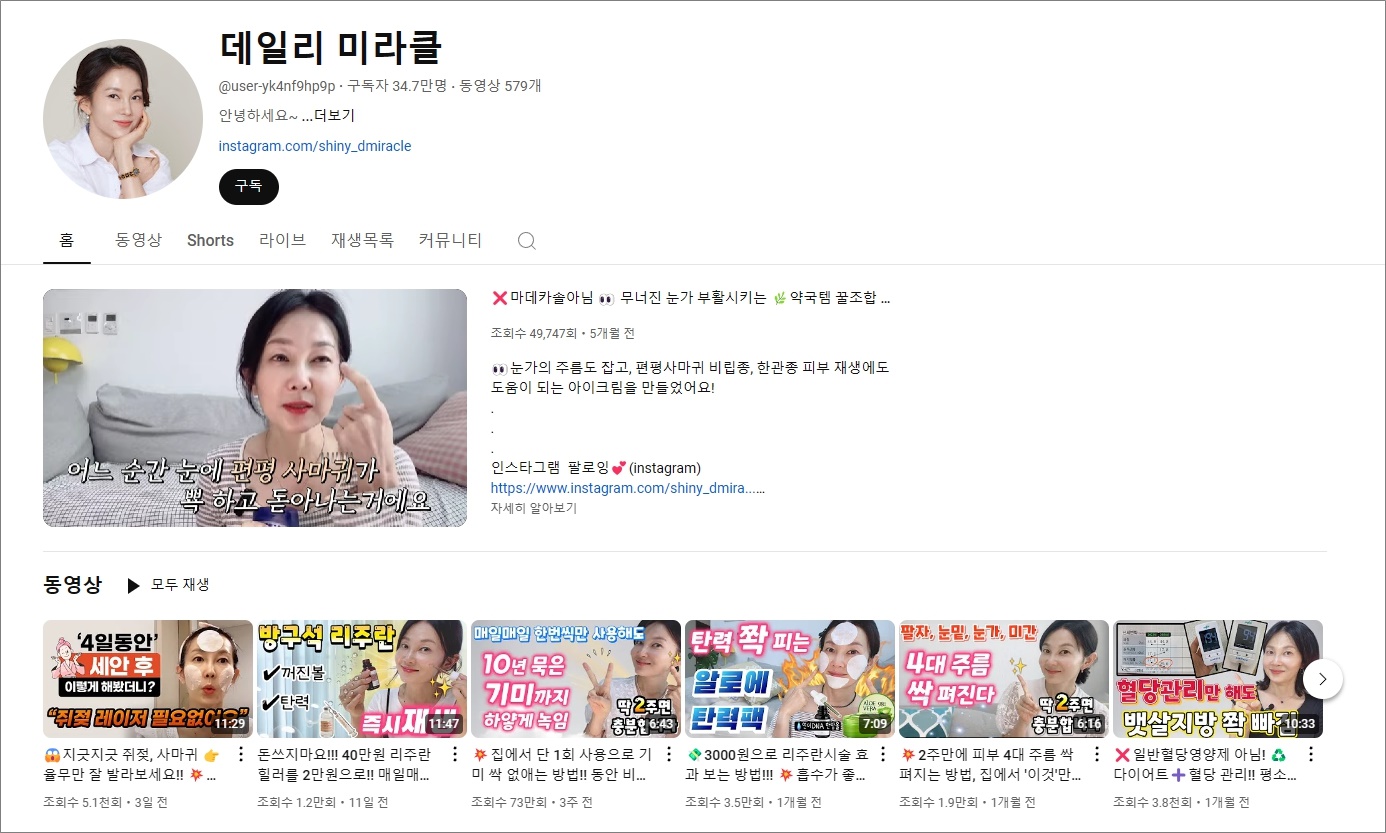 끝사랑 정은주 유튜브를 보면 피부관리, 주름 관리 등 집에서 할 수 있는 홈케어 방법을 알려주는데 유용한 정보도 많고 열심인 것 같습니다.