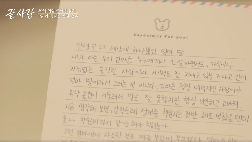 끝사랑 입소 첫날 출연자들을 응원하는 가족들의 편지를 공개하는 시간이 있었는데, 정은주는 딸에게 편지를 받았습니다.