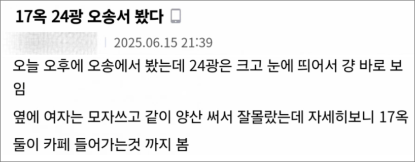 17기 옥순과 24기 광수가 오송역 인근에서 만나는 것을 봤다며 사진과 함께 목격담이 올라온 것인데요. 두 사람 함께 산책하고 카페에 들어가는 것까지 봤다는 목격자.