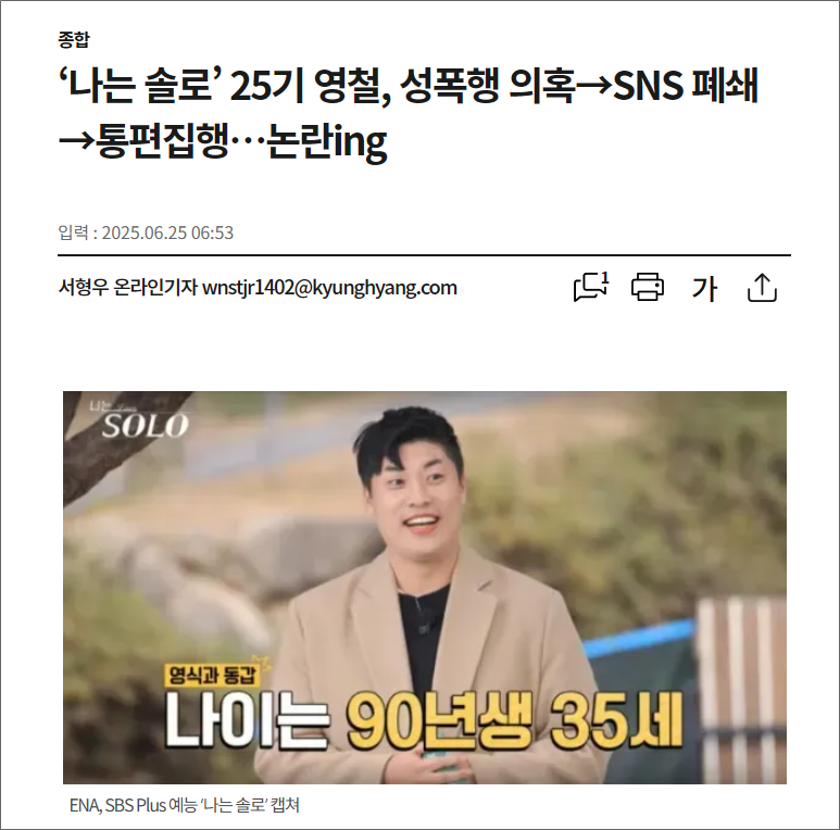 나는 솔로에 이어 나솔 사계에도 출연한 25기 영철 현재 안 좋은 일에 연루된 것이 아니냐는 추측이 이어지며 논란이 있었는데 사실인 것 같습니다.