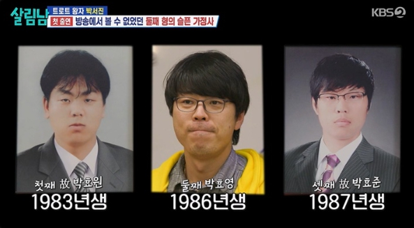 박서진 고등학교 중퇴 이유는 갑작스러운 죽음을 맞이한 형들과 관련이 있는데요. 박서진 현재 형이 한 명이 있는데, 원래 형이 두 명이 더 있었습니다. 두 형들은 지병으로 이 세상에 없습니다. 첫째 형은 간 이식 후 약 거부반응으로 27세에 사망했고, 둘째 형은 만성신부전증 악화로 23세에 사망했습니다.