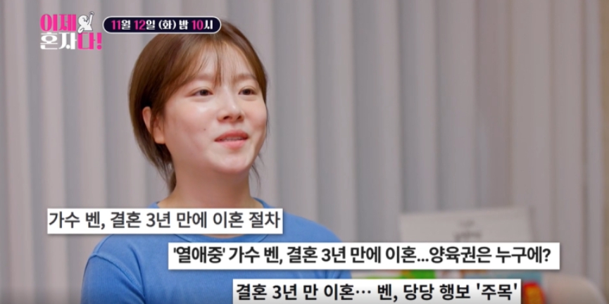 벤 TV조선 예능 '이제 혼자다'에 출연해 전 남편 이욱과의 결혼생활과 이혼 사유, 근황 소식에 대해 알리며 화제가 되고 있습니다.