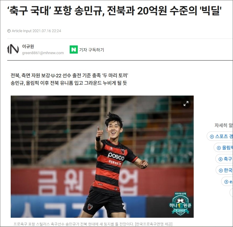 송민규 2021년 20억이라는 전북 구단의 최고 이적료를 받고 전북 현대로 이적 후 현재 전북현대모터스에서 활약하고 있는 선수입니다.
