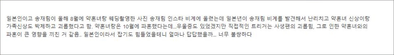 송재림 사망 이후 한 온라인 커뮤니티에 송재림과 약혼녀의 뒷모습이라는 사진과 함께 송재림 사망 원인이 악성팬의 괴롭힘에 약혼녀와 파혼까지 했고 그래서 힘들었던 게 아니냐는 추측성 글이 올라왔습니다.