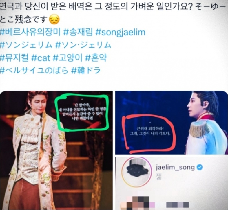 송재림에게는 일본인 악생팬이 있었는데 그 팬은 "당신의 연기력으로 안 좋은 본성을 숨길 수 있냐", "시원찮은 배우에게 눈을 돌릴 사람은 없을 것", "팬들이 준 선물도 OO에게 바친다"는 저격성 게시글을 남기는 등 평소 송재림을 괴롭혀 왔다고 하는데요.