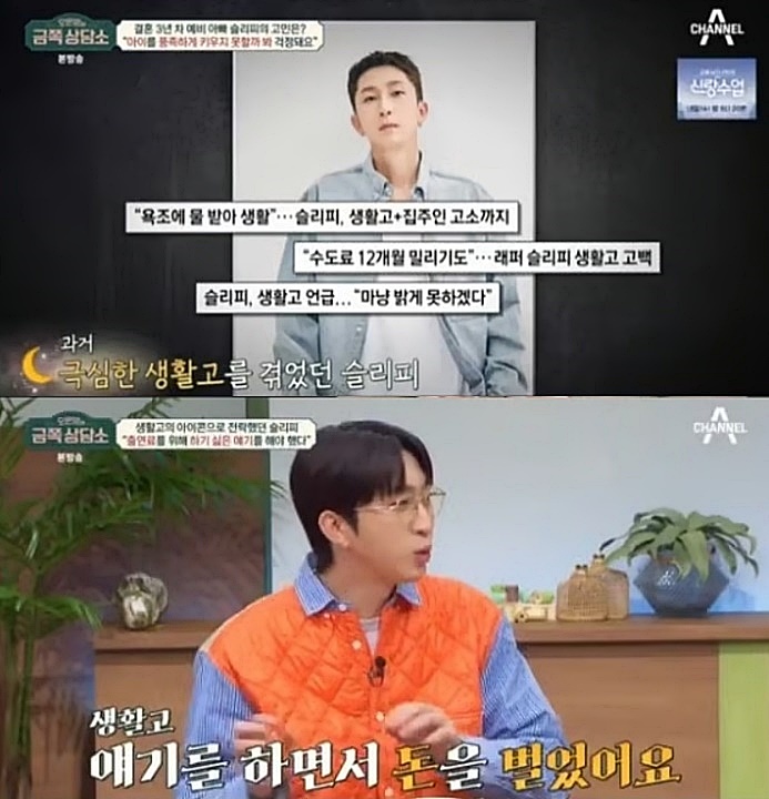 가수 슬리피가 오랜만에 '동상이몽'에 출연해 둘째를 임신 중이라는 소식과 함께 신혼 초 '처제 집 살이'에서 탈출, 생활고에서 벗어나 수많은 지인들의 축의금으로 마련한 새 보금자리를 공개, 경제적 은인인 아내와 방탄소년단 RM과의 깊은 인연도 공개를 했습니다.
