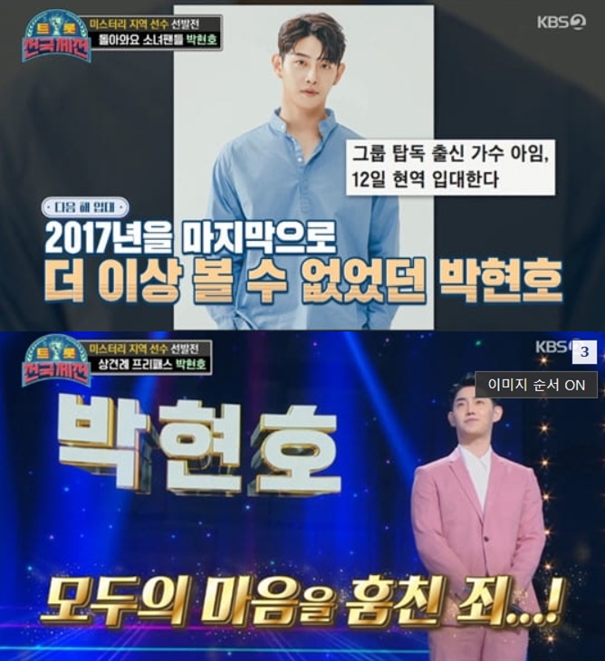 이후 2018년 3월 군대에 입대했으며, 제대 후 2020년 5월 본인의 본명인 박현호로 복귀 후 트로트 가수로 전향 뜻을 밝혔으며, 2020년 KBS 트롯 전국체전에 출전, 이후 MBN 불타는 트롯맨에도 참가해 이름을 알렸습니다.