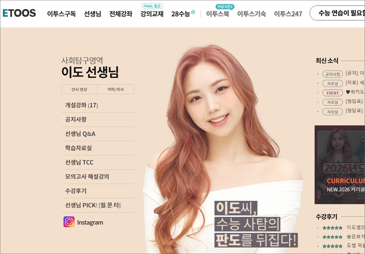 매력적인 강사 이도 앞으로 변함없는 열심 강의로 많은 수능생들의 사랑을 받는 스타강사로 오랫동안 볼 수 있길 바라며, 좋은 분 만나서 예쁜 연애 하시길 바라겠습니다!
