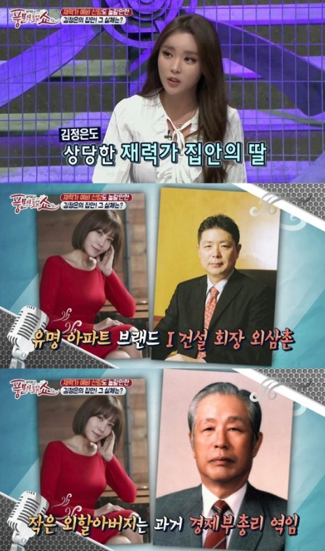 배우 김정은 집안은 외삼촌이 유명 아파트 브랜드 건설사 회장, 작은 외할아버지는 과거 경제부총리를 역임, 김정은 어머니는 미스코리아 경북 출신, 이모는 미스코리아 진 출신으로 이서진 못지않은 재력가 집안 딸로 이서진 김정은 두 사람 열애가 더 화제가 되기도 했습니다.