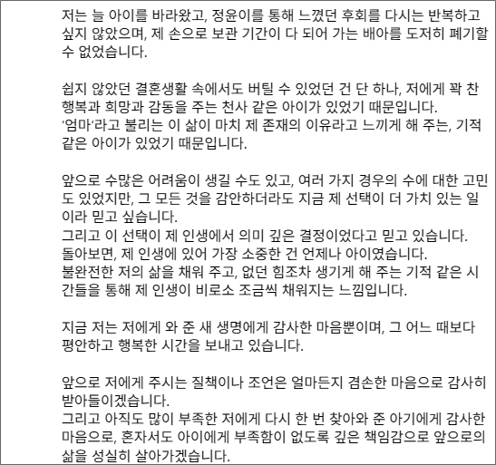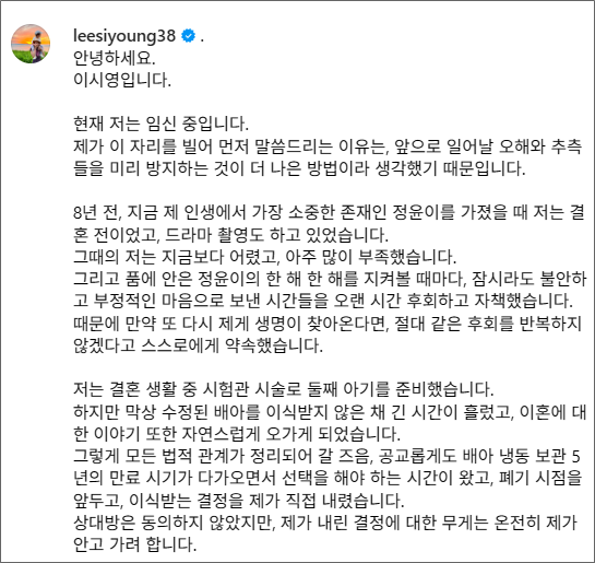 이시영 "남편과 쉽지 않았던 결혼생활 속에서도 버틸 수 있었던 건 단 하나, 꽉 찬 행복과 희망과 감동을 주는 천사 같은 아이가 있었기 때문이다"며 "상대방이 동의는 하지 않았지만, 결정의 무게는 제가 온전히 감당하겠다"고 전했습니다.