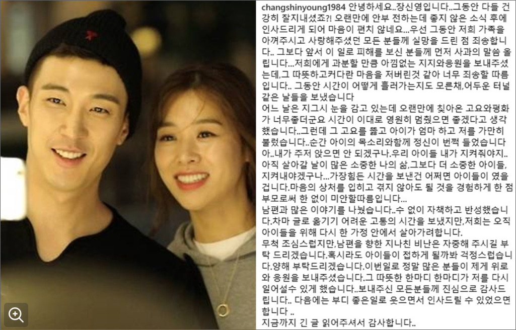 강경준과 오랜 대화를 나눈 뒤 남편을 용서하고 가정을 지키기로 했다며 실망했을 모든 분께 진심으로 사과드린다는 말과 함께 한동안 방송에 보이지 않았던 장신영 강경준 소송이 마무리된 후 방송에 복귀했었습니다.