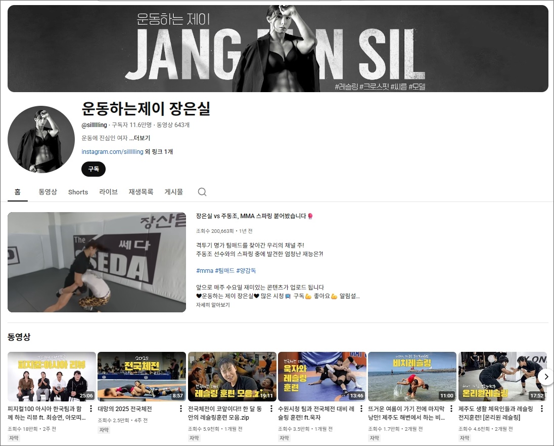 장은실 유튜브 '운동하는 제이 장은실' 채널을 운영 중인 유튜버로 2024년 8월에는 유튜버 활동의 하나로 프로 레슬링을 배우기도 했으며, 주짓수에도 도전, 여러 운동 관련 유튜브 채널과 예능에 출연 중으로 다방면에 도전 중이고 날로 인기가 상승 중인데요.