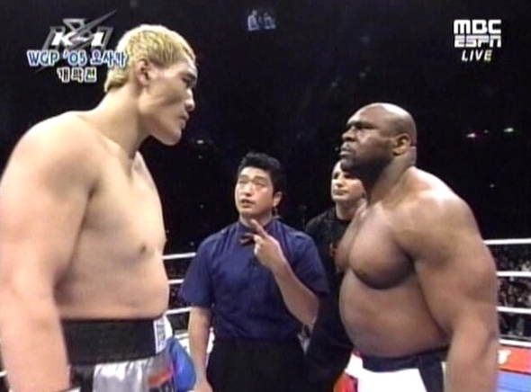 최홍만 2005년 K-1 서울 그랑프리 토너먼트 첫 경기에서 상대 선수를 KO로 꺾으며 격투기 데뷔를 했고, 키 218cm, 체중 163kg, 리치 235mm, 발사이즈 360mm에 근육량이 141kg으로 거의 온몸이 근육으로 이루어진 격투기 역사상 초월적인 수준의 피지컬로 압도적인 경기를 보여주곤 했는데요.