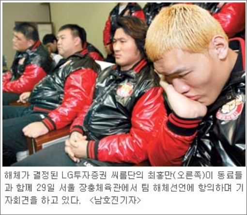 그런데 2004년 12월 6일 황소씨름단이 LG 투자 증권 매각으로 해체가 되었고, 최홍만 2004년 12월 16일 K-1 진출을 밝히며 이후 K1 선수로 전향해 활동했습니다.