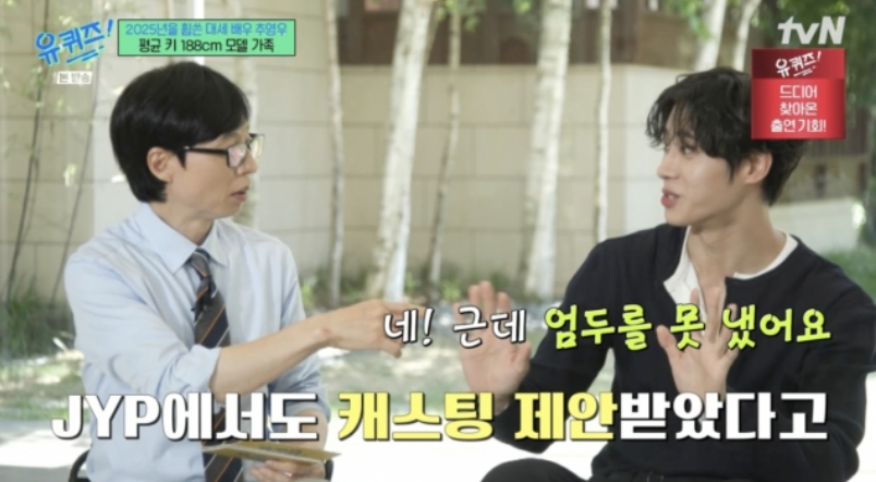 추영우 대입을 앞두고 가고 싶은 과가 없어서 많이 고민했었다고 하는데요. 고2 겨울 길거리에서 JYP엔터테인먼트 명함을 받아서 아이돌을 할뻔한 기회가 있었고, 엄마가 나이가 많아 아이돌은 안 될 것 같다고 반대했었다고.