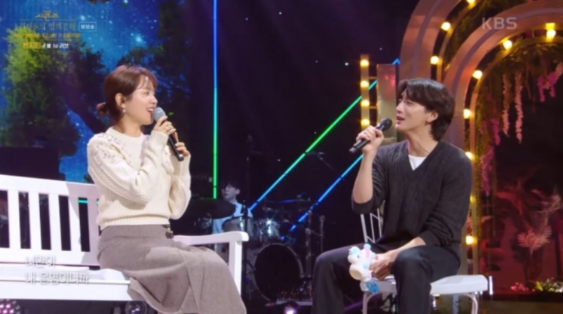 이어 최정훈은 '우리들의 블루스' OST를 좋아한다며 사랑을 시작하는 느낌이라고 설명하고 한지민과 듀엣으로 함께 노래를 불렀는데 서로를 애틋하게 바라보며 노래를 이어 가는 모습인이 인상적이었습니다.