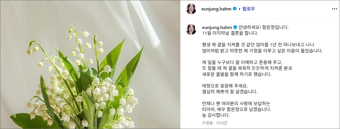 함은정은 17일 자신의 SNS를 통해 "11월 마지막 날 결혼을 한다"며 "평생 제 곁을 지켜줄 것 같던 엄마를 1년 전 떠나보내고 나니, 엄마처럼 밝고 따뜻한 제 가정을 이루고 싶은 마음이 들었다"며 직접 결혼 소식을 전하기도 했습니다.